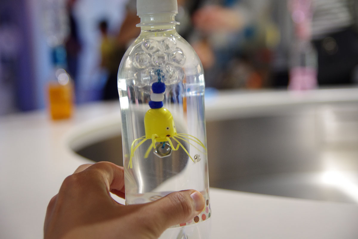 ペットボトルを利用したおもちゃ。不思議なのですが、握ると中のおもちゃが沈み、離すと浮かぶのです。