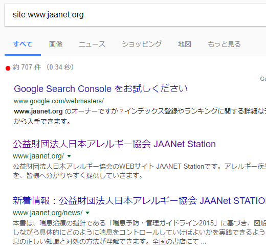 例えば、日本アレルギー協会さんのサイト(http://www.jaanet.org/ )に行ったら、アドレスバーのwwwの前にsite:(コロン)と打ち込んで検索します。