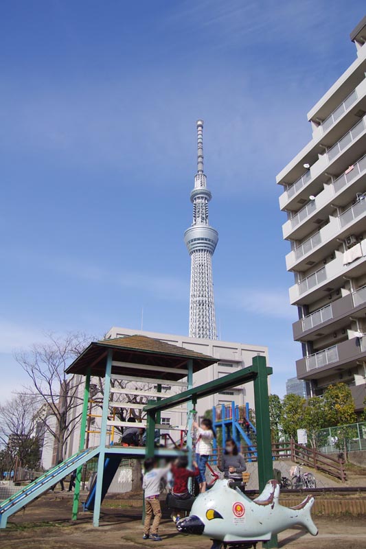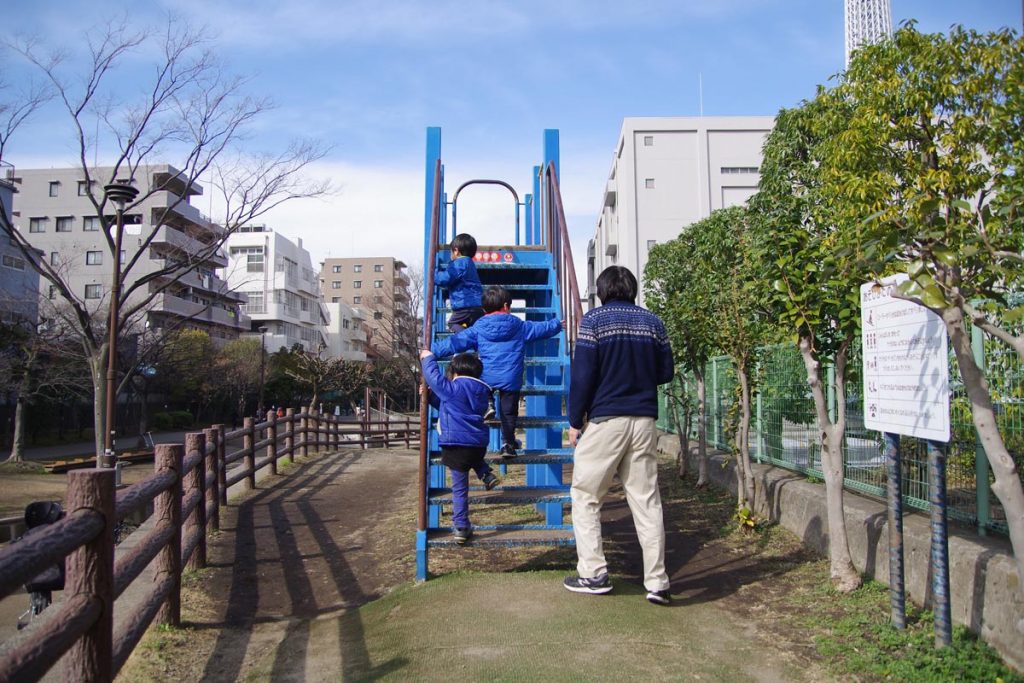 幅は30~40m、長さは1.85kmと南北に長い公園で、東京スカイツリーを見ながら遊具遊びに興じることができ、人工河川が流れる横にはいくつかの遊具エリアが点在しています。