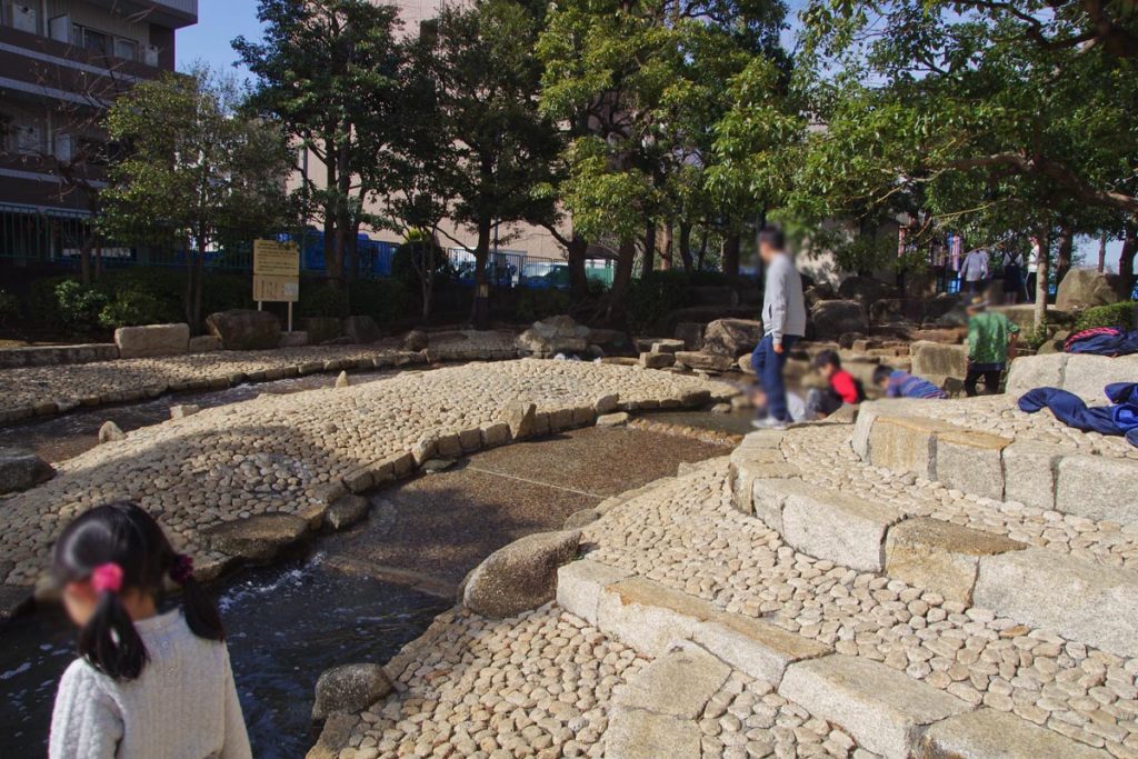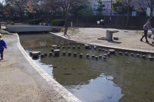 じゃぶじゃぶ池のスタート地点は渓流のような流れ。石積みの橋もあって、子供達がバランスを取りながら渡っていました。(落ちている子どももいました(笑))